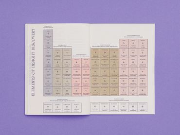 Insight Alchemy includes a periodic table, the “Elements of Insight Discovery”, which is a crib sheet summarizing the insightful behaviors and mental-models of Alchemists. This crib sheet is a helpful reminder and reference to those in pursuit of insight.